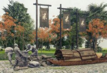 此為景觀雕塑,意在成為區域內的藝術亮點,為環境注入文化與藝術氣息,供人觀賞、感悟。運用石雕工藝塑造山巒,石材的天然紋理與厚重質感,精準呈現出山的形態與沉穩氣質,傳遞出自然山水的雄渾與靜謐。不銹鋼雕塑部分,憑借其金屬光澤與可塑造性,打造出靈動的 “絲路” 線條與卷軸造型,線條流暢且富有現代感,既象征著絲路的綿延與動態,又通過材質對比,增添視覺沖擊力。整體設計將船、山水、絲路元素融合,船是絲路行商的載體,山水營造出絲路行經的環境氛圍,不銹鋼的 “絲路” 與石雕山水、船相互映襯,展現出古代絲路貿易中,行舟于山水間、穿梭于絲路的場景,讓觀者感受絲路文化的悠遠與商貿往來的活力,將景觀雕塑的觀賞性、石雕的厚重感、不銹鋼雕塑的現代靈動性深度融合,打造出兼具文化內涵與藝術價值的作品。